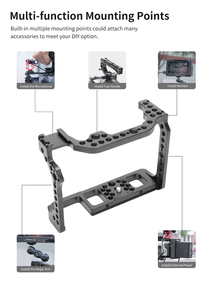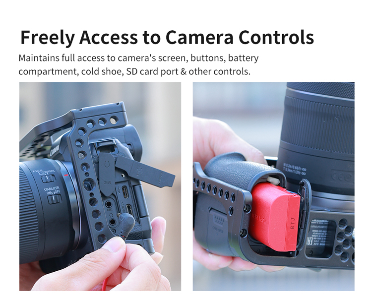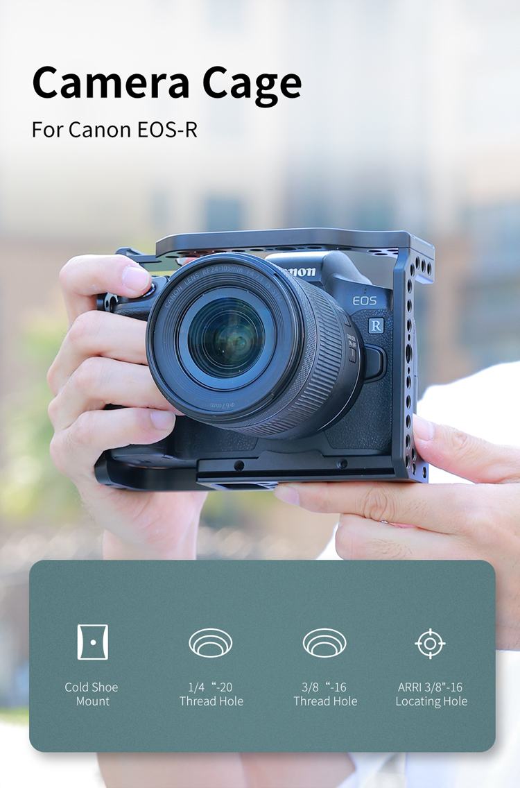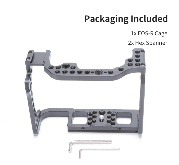 Клітка KingMa Cage R-RC з алюмінієвого сплаву розроблена спеціально для фотоапаратів Canon EOS R і призначена для кріплення допоміжного обладнання: мікрофона , спалахи, накамерного світла, монітора, шарнірних кронштейнів та ін. Зручна та легка конструкція не блокує кнопки на камері, забезпечуючи вільний доступ до батарейного відсіку та слоту для картки пам'яті. R-RC: