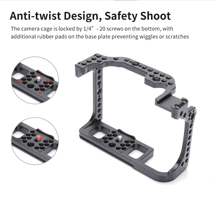 - Кріплення клітини до камери здійснюється за допомогою гвинта 1/4”-20 в основі, а також M2.5 збоку. Гумові прокладки на дні клітини захищають корпус фотоапарата від подряпин.