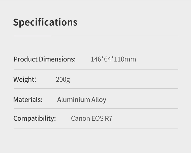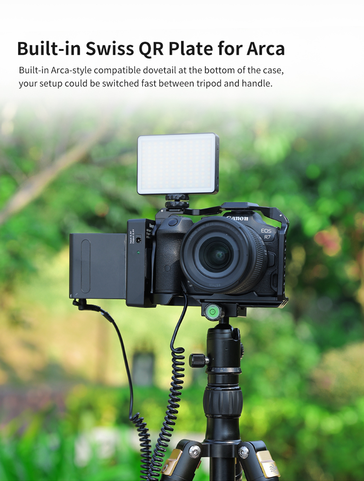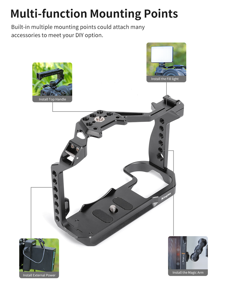 Клітка KingMa Cage R7-RC з алюмінієвого сплаву розроблена спеціально для фотоапаратів Canon R7-RC і призначена для кріплення допоміжного обладнання: мікрофону, спалаху, накамерного світла, монітора, шарнірних кронштейнів та ін. Зручна та легка конструкція не блокує кнопки на камері, забезпечуючи вільний доступ до батарейного відсіку та слоту для картки пам'яті.]: