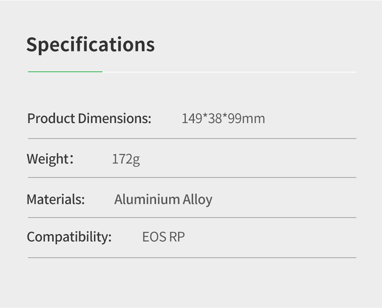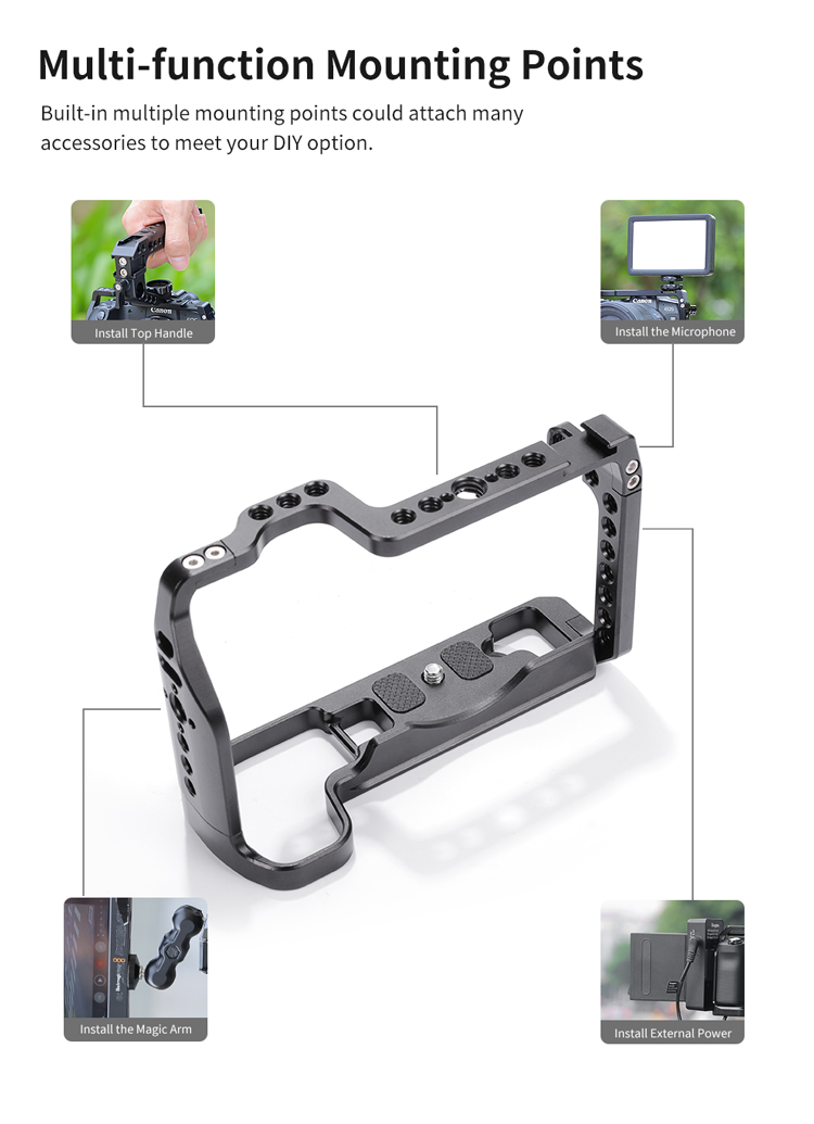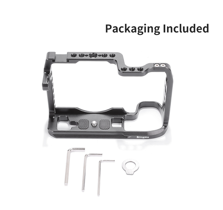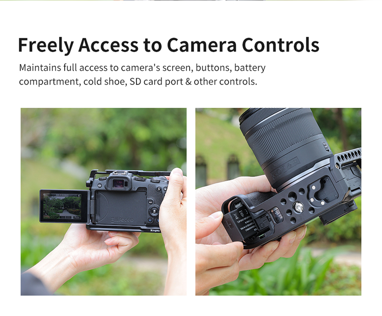 Клітка KingMa Cage RP-RC з алюмінієвого сплаву розроблена спеціально для фотоапаратів Canon RP-RC і призначена для кріплення допоміжного обладнання: мікрофону, спалаху, накамерного світла, монітора, шарнірних кронштейнів та ін. Зручна та легка конструкція не блокує кнопки на камері, забезпечуючи вільний доступ до батарейного відсіку та слоту для картки пам'яті.]: