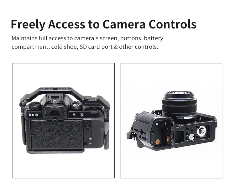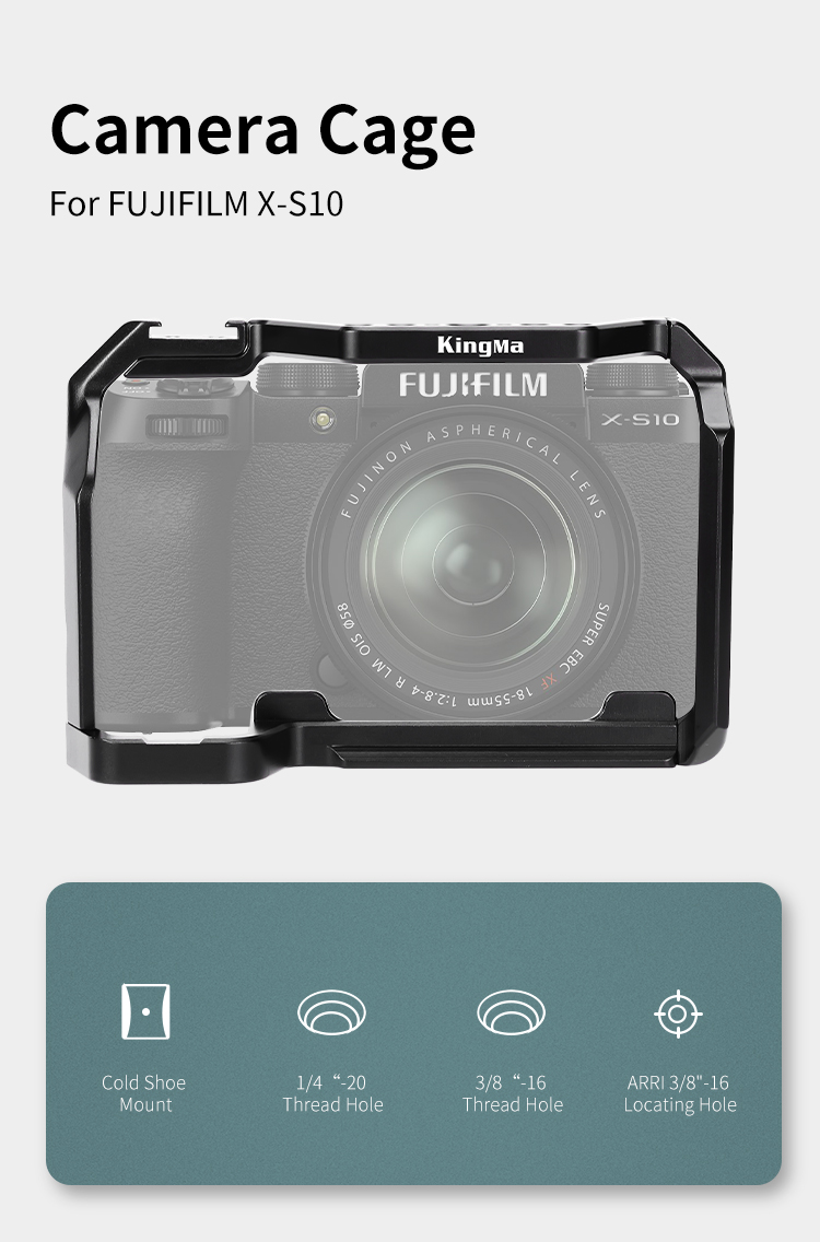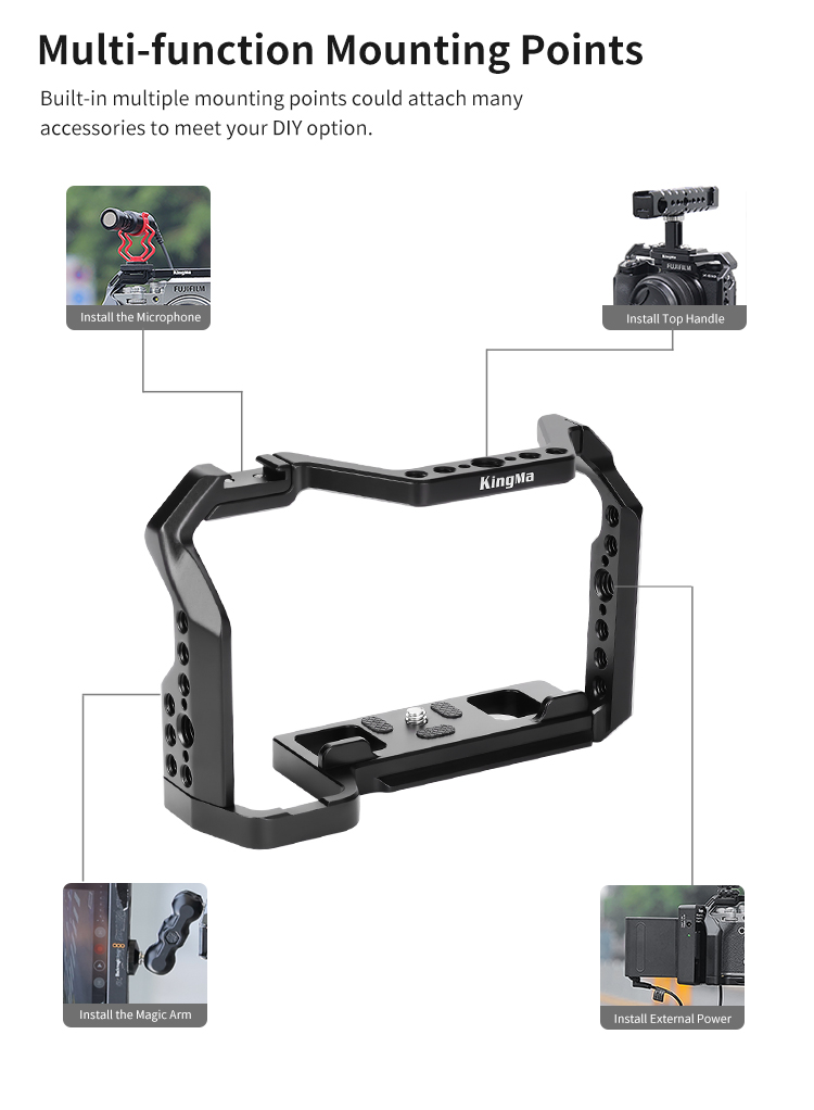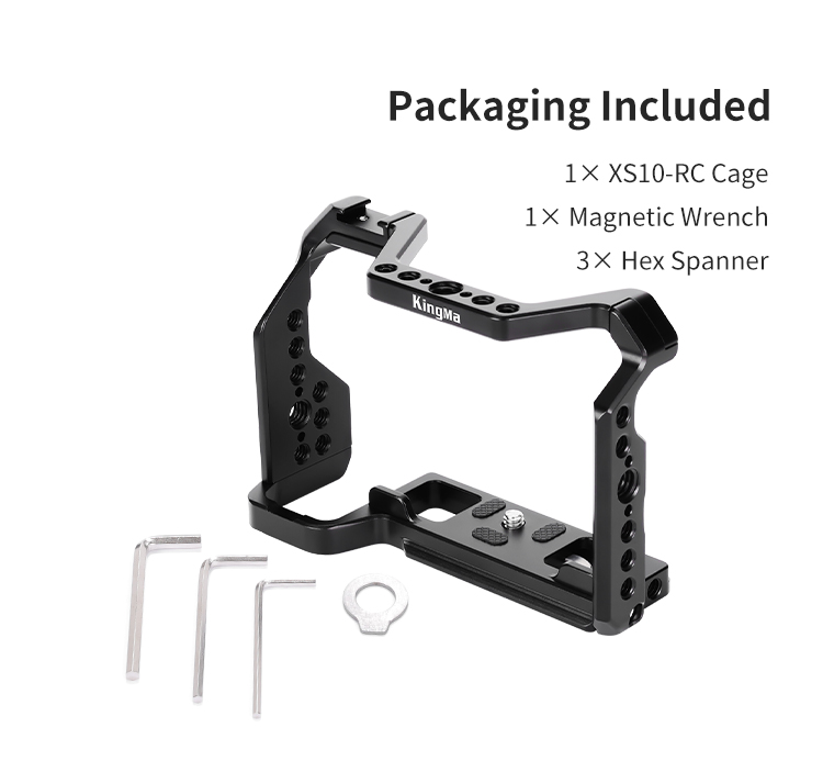 Клітка KingMa Cage XS10-RC з алюмінієвого сплаву розроблена спеціально для фотоапаратів Fujifilm XS10-RC і призначена для кріплення допоміжного обладнання: мікрофону, спалаху, накамерного світла, монітора, шарнірних кронштейнів та ін. Зручна та легка конструкція не блокує кнопки на камері, забезпечуючи вільний доступ до батарейного відсіку та слоту для картки пам'яті.]: