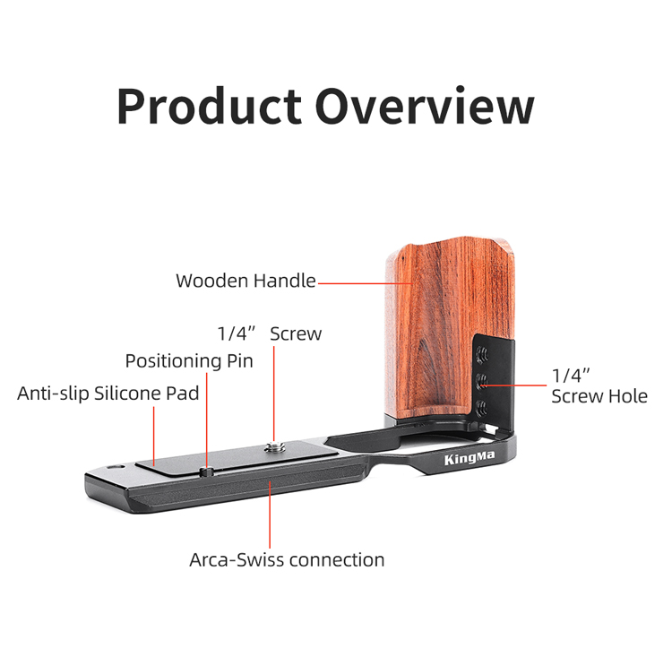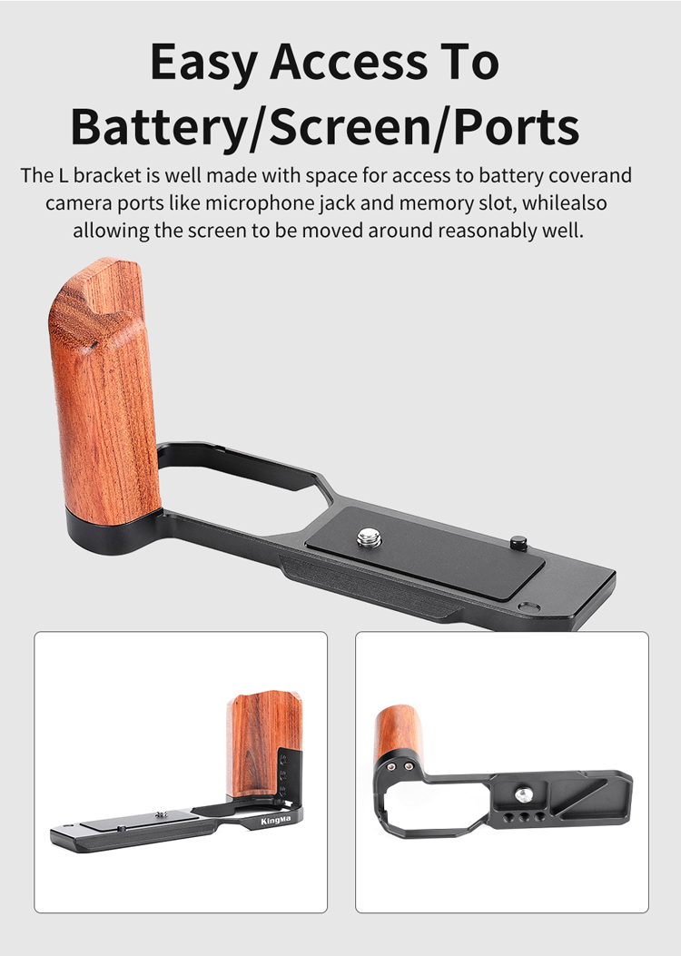 Бічна ручка KingMa L-Bracket KM-ZF з алюмінієвого сплаву розроблена спеціально для фотоапаратів Nikon KM-ZF і призначена для зручності горизонтальної та вертикальної зйомки, а також кріплення допоміжного обладнання: мікрофона, накамерного світла, монітора та ін. Зручна та легка конструкція не блокує кнопки на камері, забезпечуючи вільний доступ до батарейного відсіку та слоту для картки пам'яті. Bracket KM-ZF: