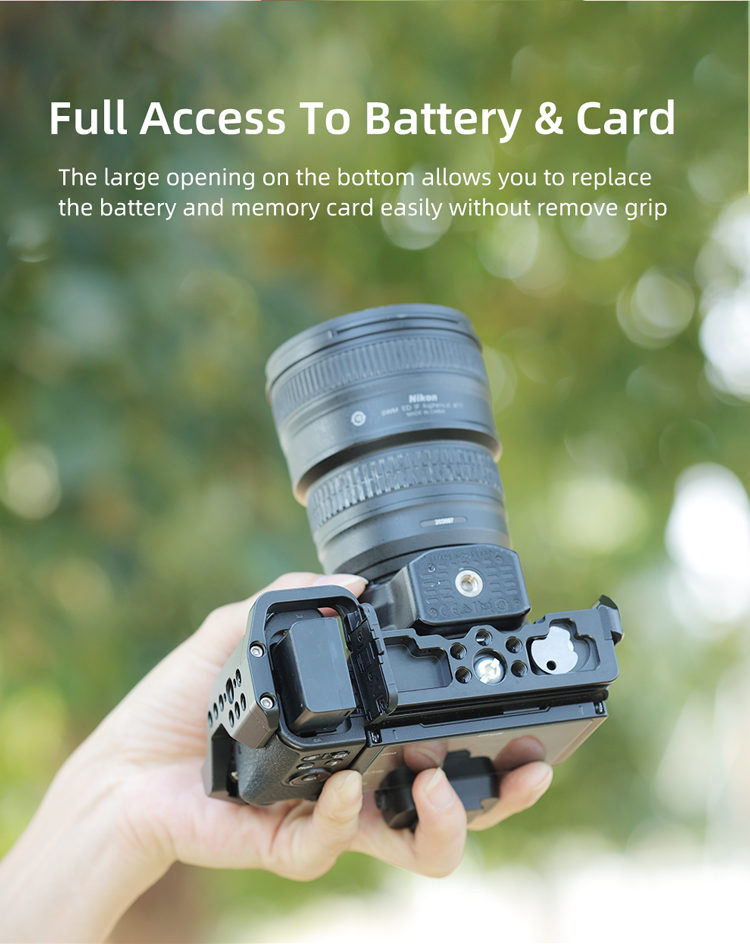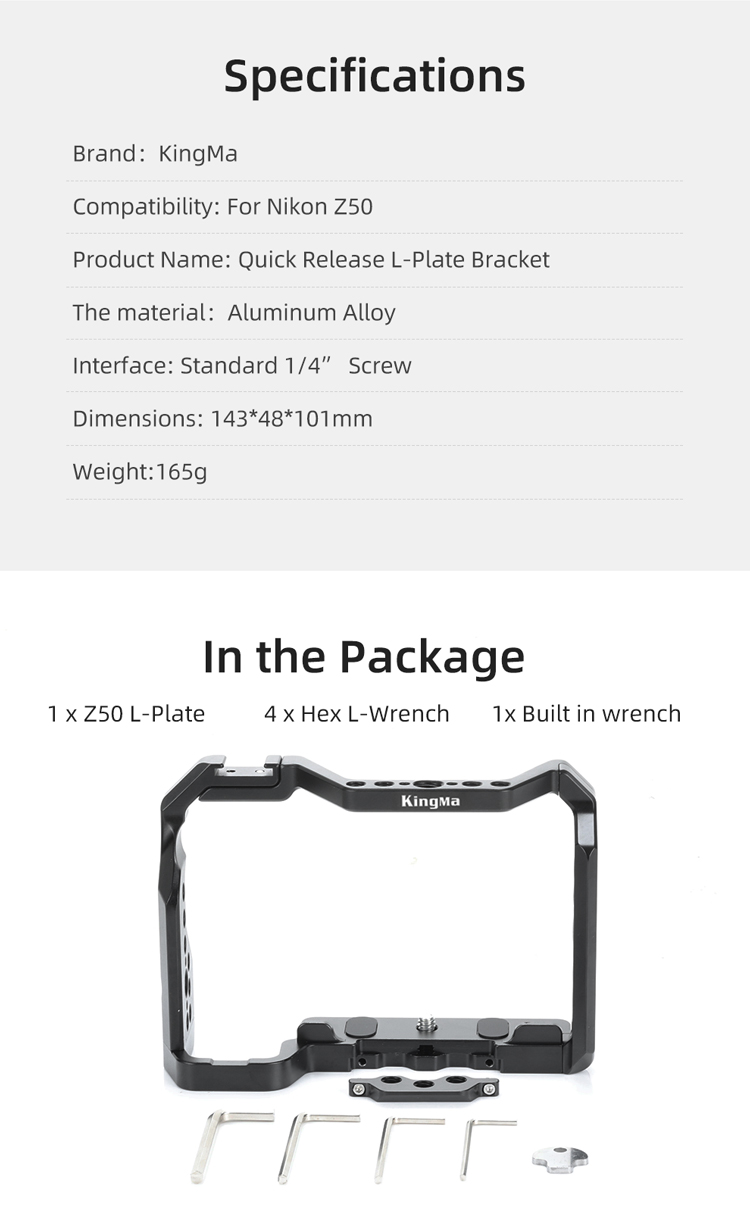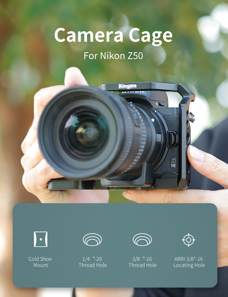 Клітка KingMa Cage Z50-RC з алюмінієвого сплаву розроблена спеціально для фотоапаратів Nikon Z50-RC і призначена для кріплення допоміжного обладнання: мікрофону, спалаху, накамерного світла, монітора, шарнірних кронштейнів та ін. Зручна та легка конструкція не блокує кнопки на камері, забезпечуючи вільний доступ до батарейного відсіку та слоту для картки пам'яті.]: