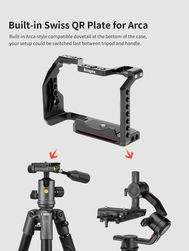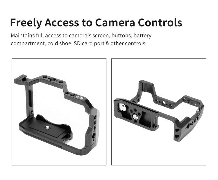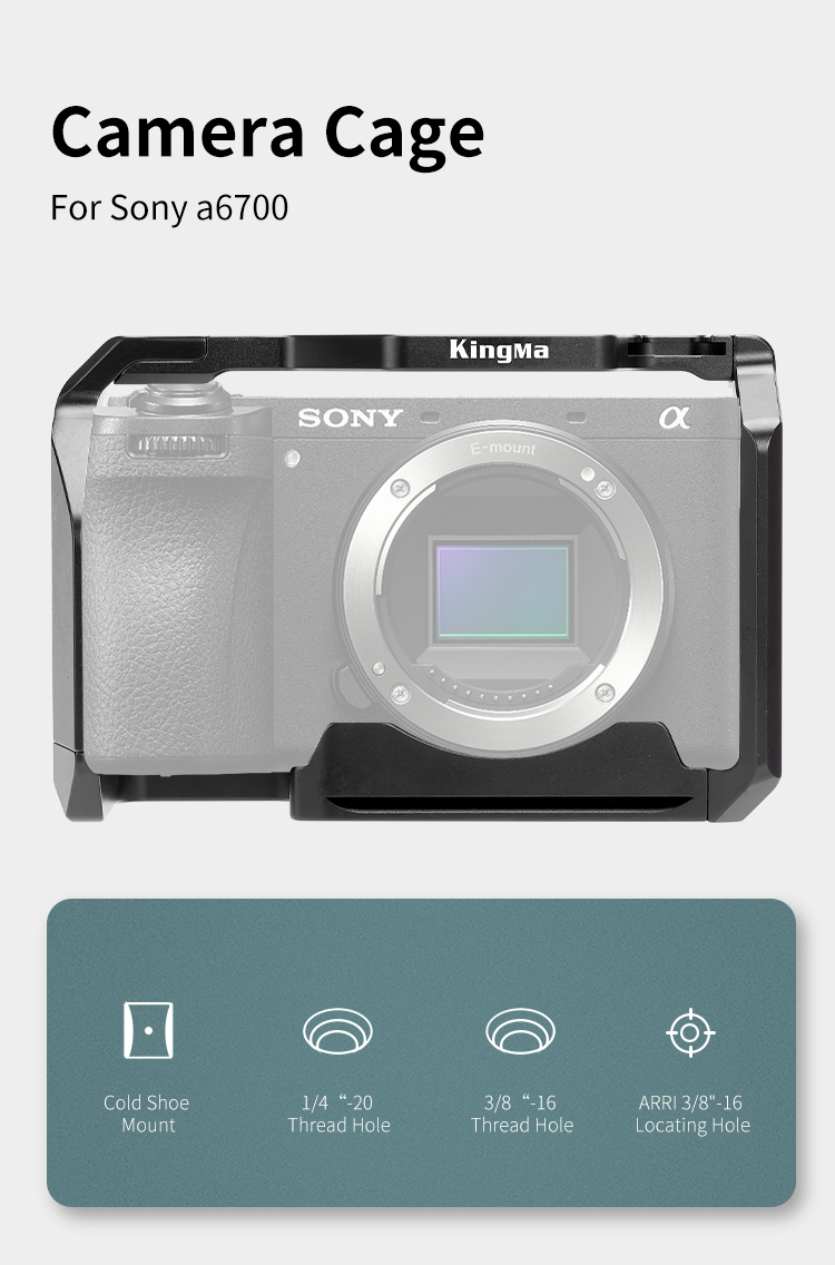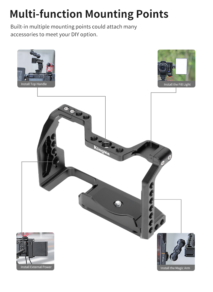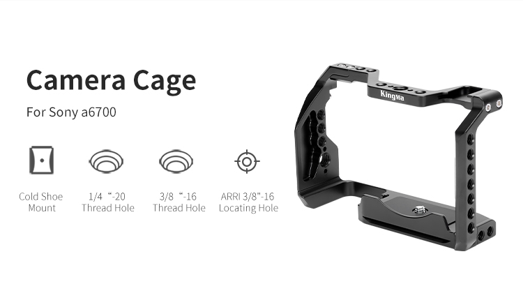 Клітка KingMa Cage A6700-RC з алюмінієвого сплаву розроблена спеціально для фотоапаратів Sony A6700-RC і призначена для кріплення допоміжного обладнання: мікрофону, спалаху, накамерного світла, монітора, шарнірних кронштейнів та ін. Зручна та легка конструкція не блокує кнопки на камері, забезпечуючи вільний доступ до батарейного відсіку та слоту для картки пам'яті.]: