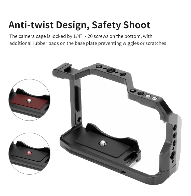 - Кріплення клітини до камери здійснюється за допомогою гвинта 1/4”-20 в основі, а також M2.5 збоку. Гумові прокладки на дні клітини захищають корпус фотоапарата від подряпин. Для режиму ручної зйомки передбачені отвори для плечового ременя та ремінця на зап'ясті.