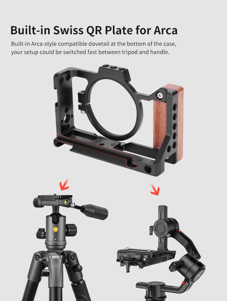 - Кріплення клітини до камери здійснюється за допомогою гвинта 1/4”-20 в основі, а також M2.5 збоку. Гумові прокладки на дні клітини захищають корпус фотоапарата від подряпин.