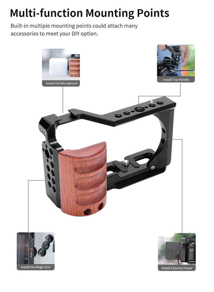 Клітка KingMa Cage ZVE10II-RC з алюмінієвого сплаву розроблена спеціально для фотоапаратів Sony ZV-E10 II і призначена для кріплення допоміжного обладнання: мікрофона , спалахи, накамерного світла, монітора, шарнірних кронштейнів та ін. Зручна та легка конструкція не блокує кнопки на камері, забезпечуючи вільний доступ до батарейного відсіку та слоту для картки пам'яті. ZVE10II-RC: