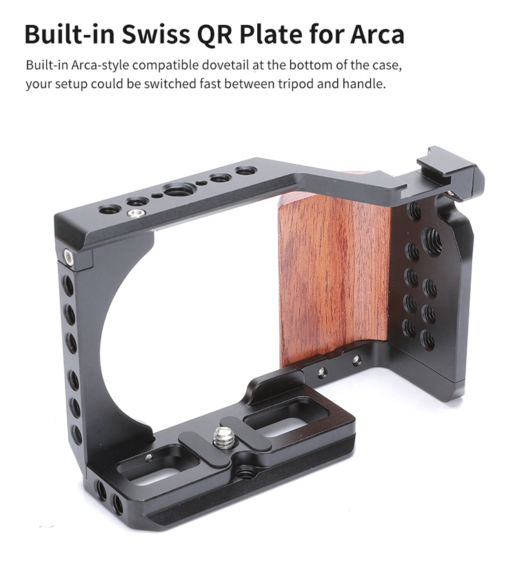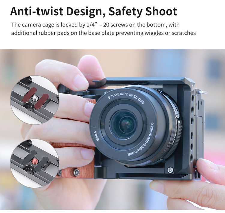 - Кріплення клітини до камери здійснюється за допомогою гвинта 1/4”-20 в основі, а також M2.5 збоку. Гумові прокладки на дні клітини захищають корпус фотоапарата від подряпин.