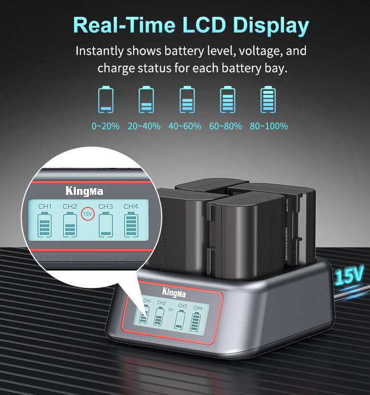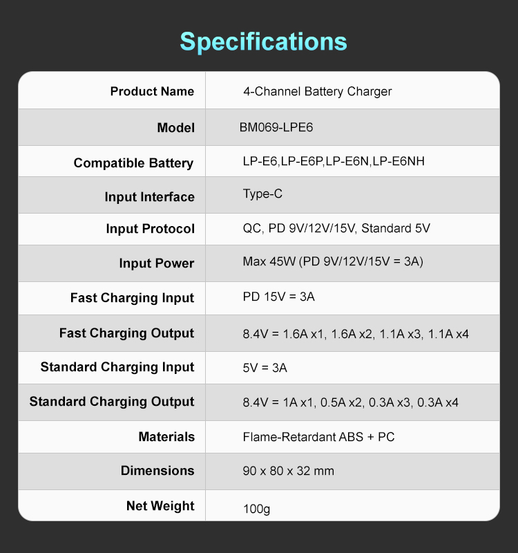 Швидкий і компактний зарядний пристрій KingMa BM069-LPE6 дозволяє зардяджати одночасно 4 акумулятора Canon LP-E6 . В режимі швидкої зарядки (PD 15V 3A) ви зможете повністю зарядити 4 акумулятора лише за 2.5 години. Кожен слот заряджається незалежно з автоматичним визначенням напруги.