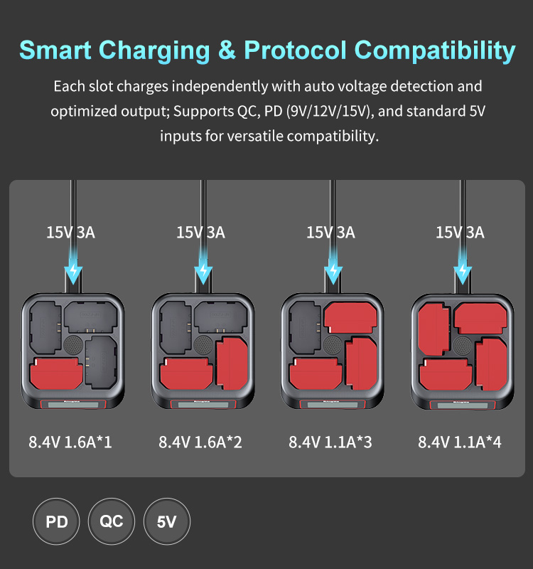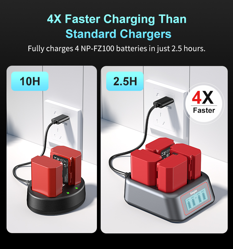 Швидкий і компактний зарядний пристрій KingMa BM069-FZ100 дозволяє зардяджати одночасно 4 акумулятора Sony NP-FZ100 . В режимі швидкої зарядки (PD 15V 3A) ви зможете повністю зарядити 4 акумулятора лише за 2.5 години. Кожен слот заряджається незалежно з автоматичним визначенням напруги.