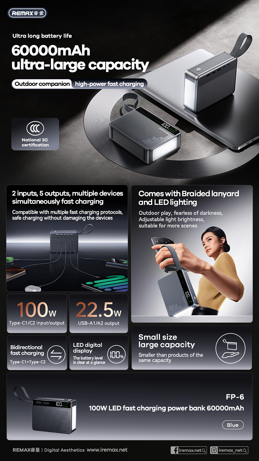 Повербанк (універсальна мобільна батарея) Remax FP-1 Blue на 60000 mAh (мА*год) — потужна, компактна і надійна мобільна батарея з LED ліхтариком з функцією швдкої зарядки - PD 100W через USB-C i QC 22.5W через USB-A - допоможе у разі потреби одночасно зарядити до 5 ваших пристроїв в найкорочших час. Повербанк Remax FP-1 підходить для зарядки ноутбуків потужністью до 100 Ватт.