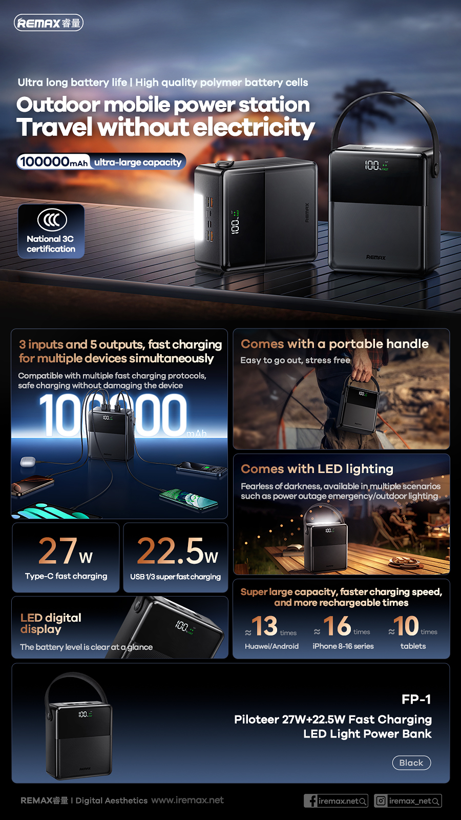 Повербанк (універсальна мобільна батарея) Remax FP-1 Black на 100000 mAh (мА*год) — потужна, компактна і надійна мобільна батарея з LED ліхтариком з функцією швдкої зарядки - PD 27W через USB-C i QC 22.5W через USB-A - допоможе у разі потреби одночасно зарядити до 5 ваших пристроїв в найкорочших час.