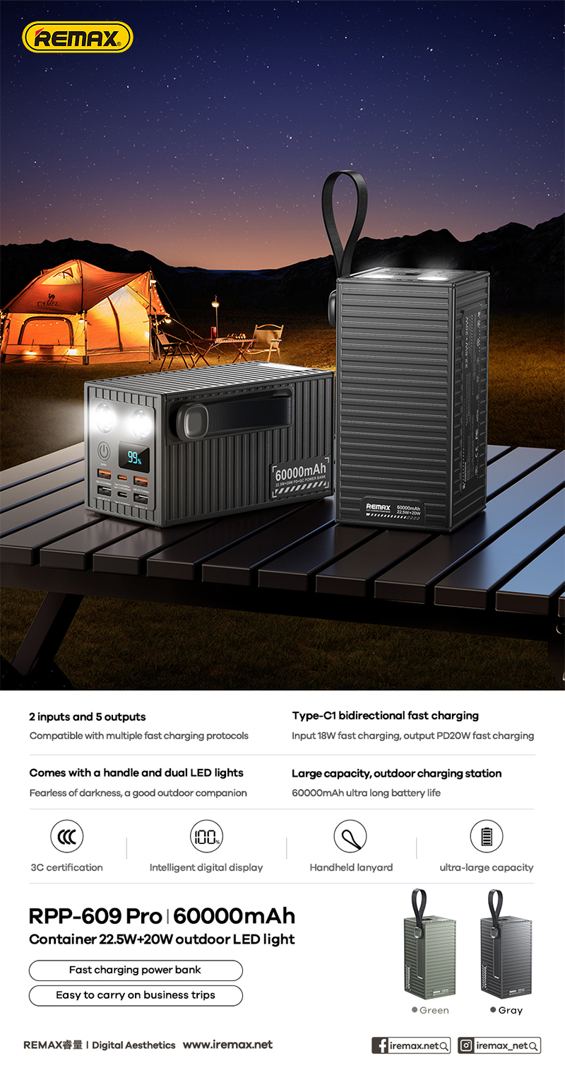 Повербанк (універсальна мобільна батарея) Remax RPP-609 Pro Grey на 60000 mAh (мА*год) — потужна, компактна і надійна мобільна батарея з LED ліхтариком з функцією швдкої зарядки - PD 20W через USB-C i QC 22.5W через USB-A - допоможе у разі потреби одночасно зарядити до 5 ваших пристроїв в найкорочших час.